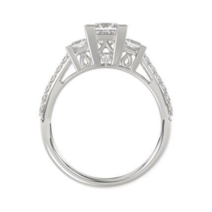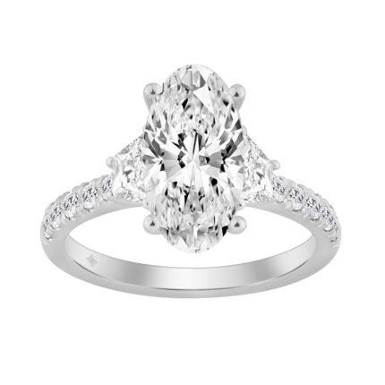2 3/4Ct White Gold Oval Cut 14K Three-Stone Engagement Ring & Round With Trapezoid Side Stones 2.00Ct Oval Center Stone (Color F-G -Clarity Vs1/V