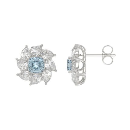 14K WHITE GOLD CRAFTED WITH 18K YELLOW GOLD BACK PLATE 2 5/8CT PEAR/BLUE CUSHION DIAMOND LADIES EARRINGS