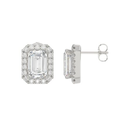 LADIES STUD EARRINGS 3 1/2CT EMERALD/ROUND DIAMOND 14K WHITE GOLD