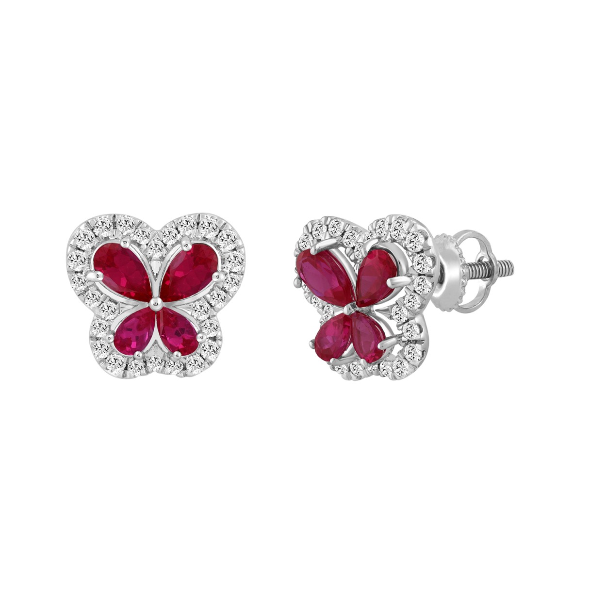 14K WHITE GOLD 1 1/2CT ROUND/RUBY DIAMOND LADIES EARRINGS (PEAR RUBY DIAMOND 8 STONE)