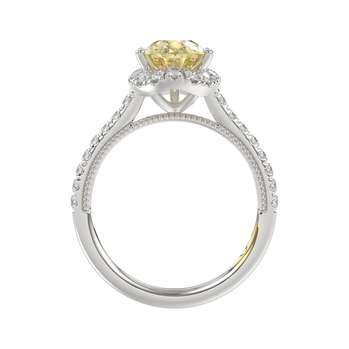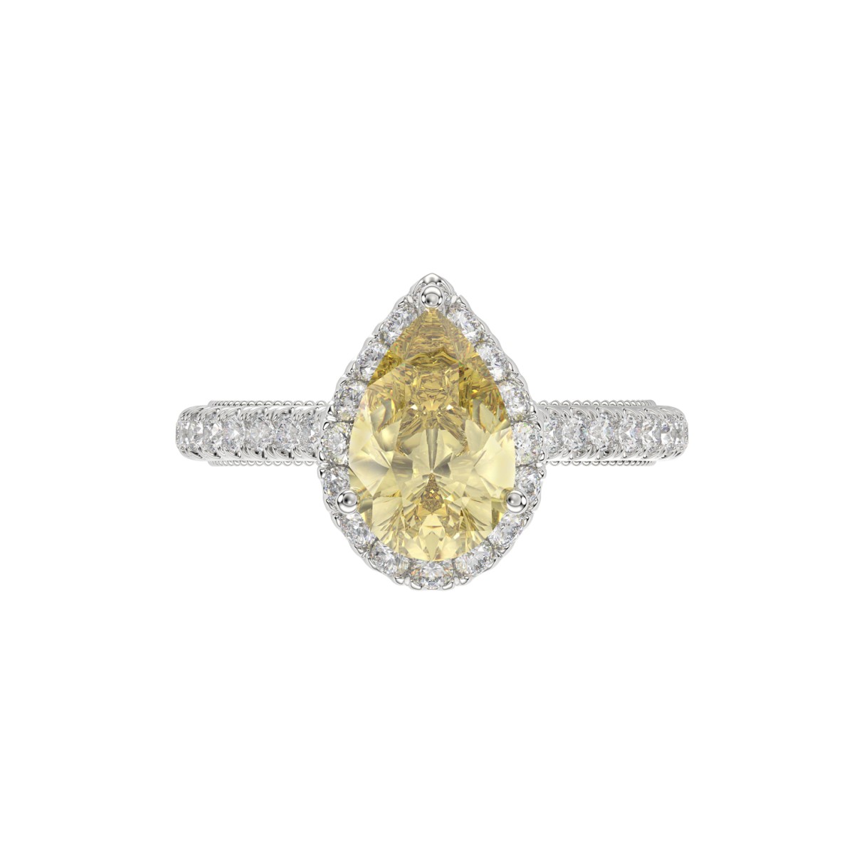 14K WHITE GOLD CRAFTED WITH 18K YELLOW GOLD SHANK 2 1/2CT ROUND/PEAR DIAMOND LADIES RING (CENTER STONE PEAR YELLOW DIAMOND 2.00CT)