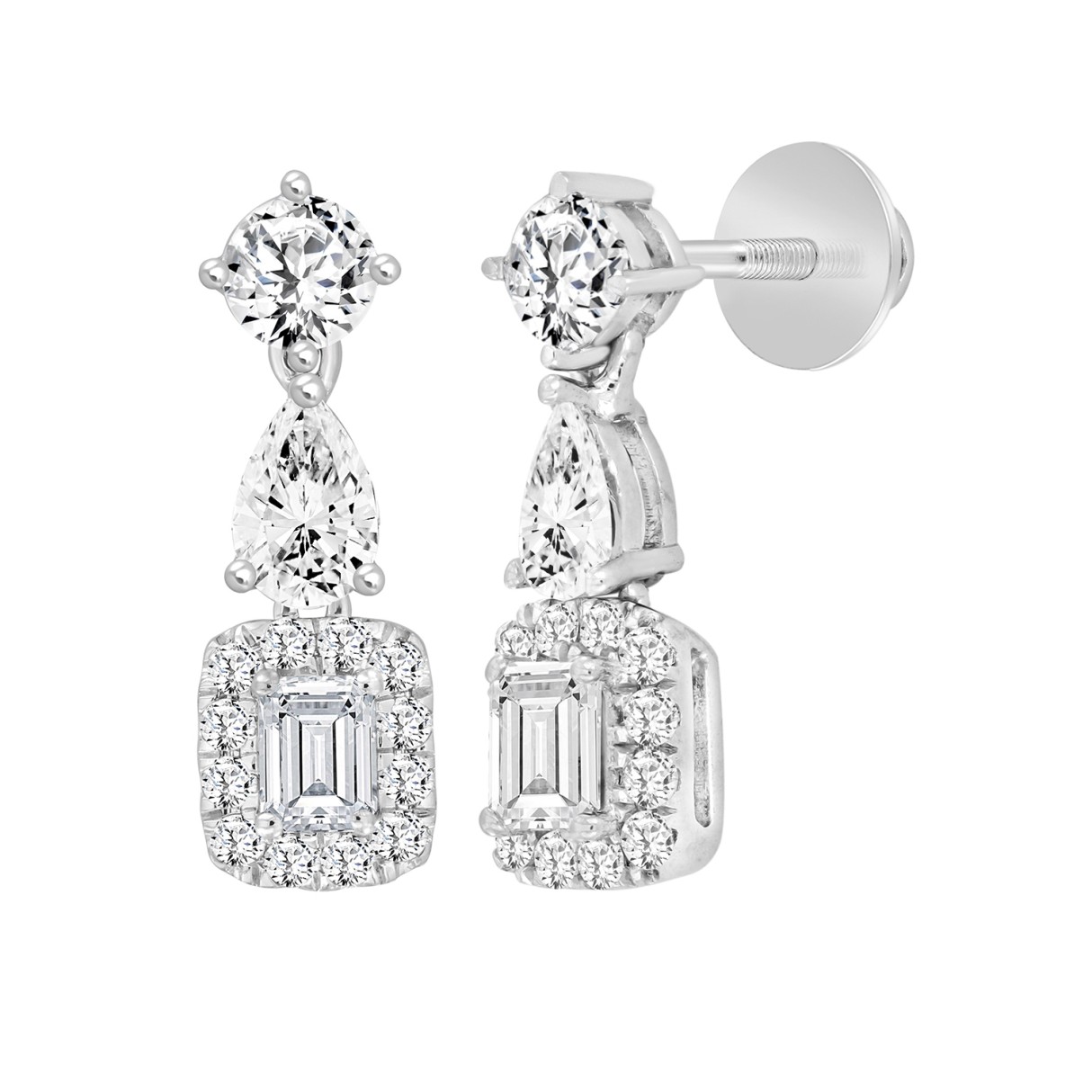 LADIES EARRINGS 2CT ROUND/EMERALD/PEAR DIAMOND 14K WHITE GOLD (CENTER STONE EMERALD DIAMOND 1/2CT )