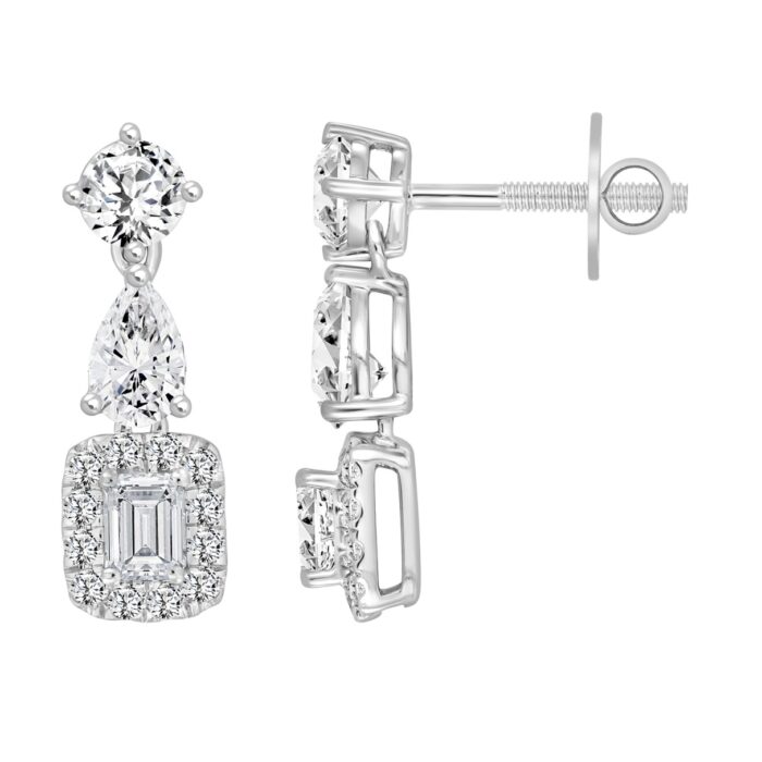 LADIES EARRINGS 2CT ROUND/EMERALD/PEAR DIAMOND 14K WHITE GOLD (CENTER STONE EMERALD DIAMOND 1/2CT )