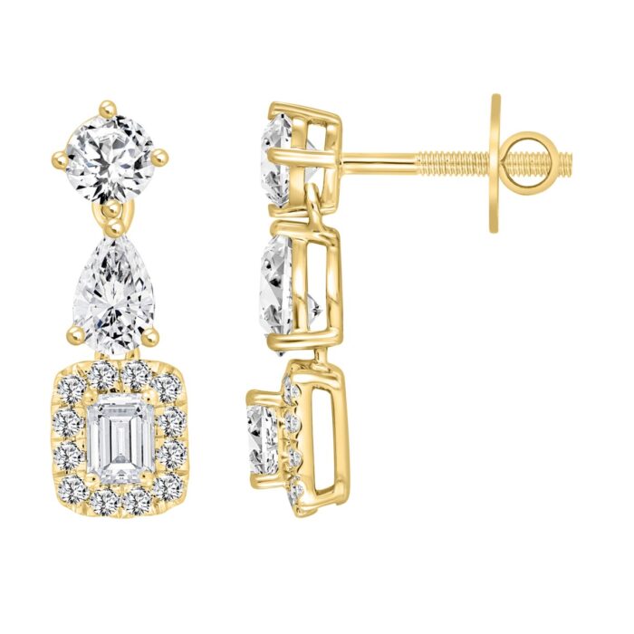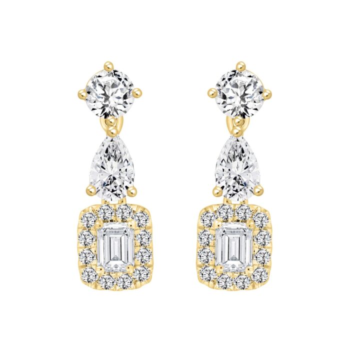 LADIES EARRINGS 2CT ROUND/EMERALD/PEAR DIAMOND 14K YELLOW GOLD (CENTER STONE EMERALD DIAMOND 1/2CT )