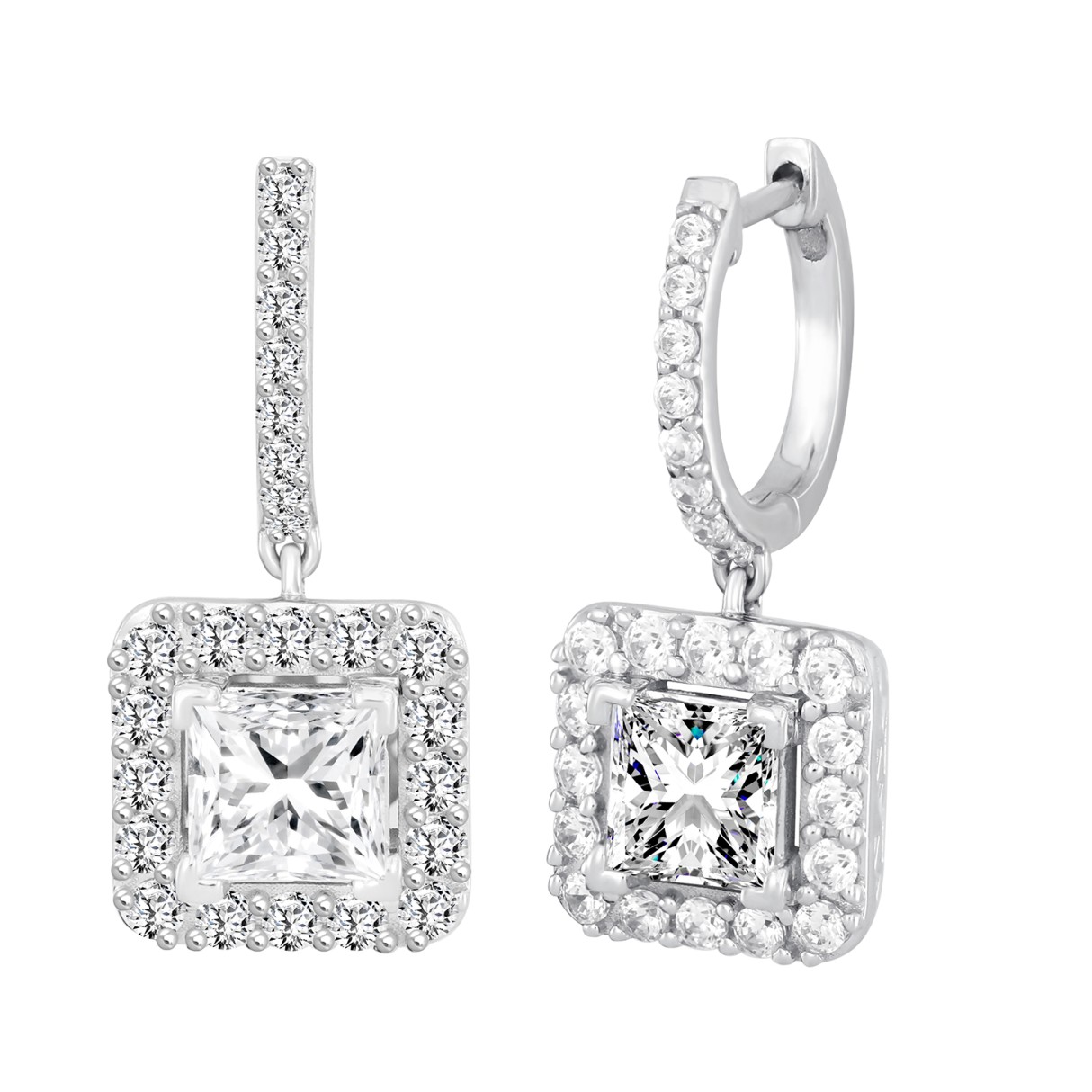 LADIES EARRINGS 3CT PRINCESS/ROUND DIAMOND 14K WHITE GOLD (CENTER STONE PRINCESS DIAMOND 2CT )