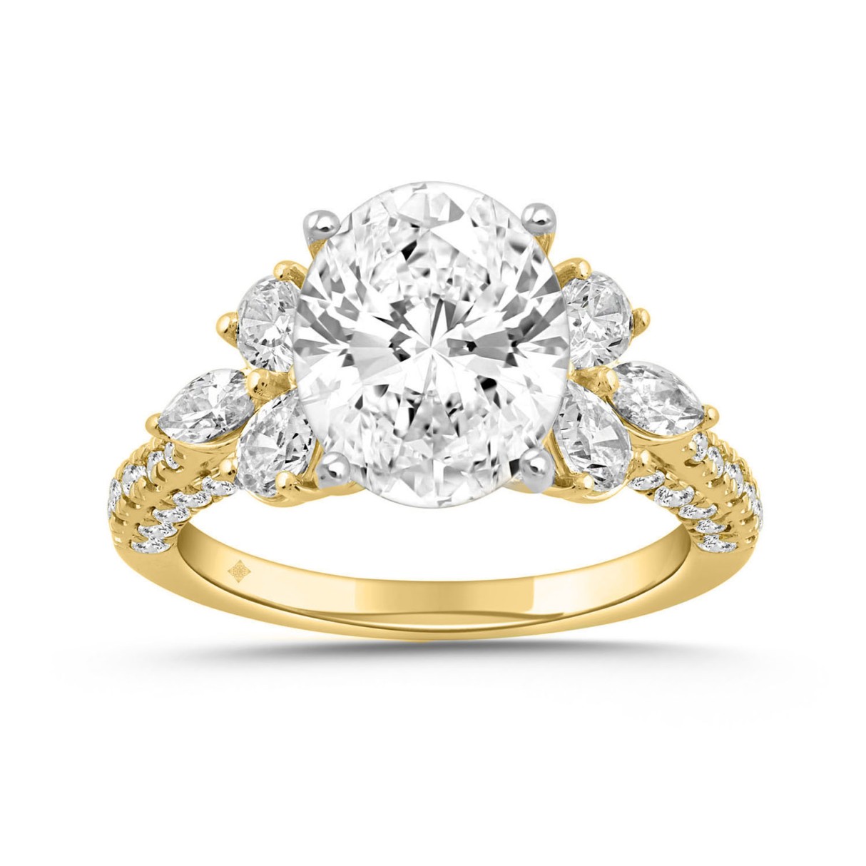LADIES RING 4 1/3CT ROUND/PEAR/OVAL/MARQUISE DIAMOND 14K YELLOW GOLD (CENTER STONE OVAL DIAMOND 3.00CT)