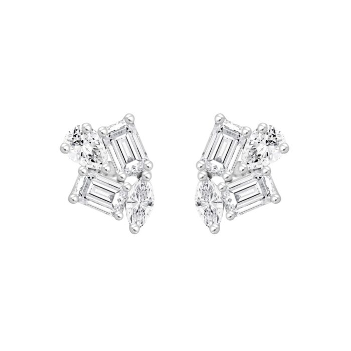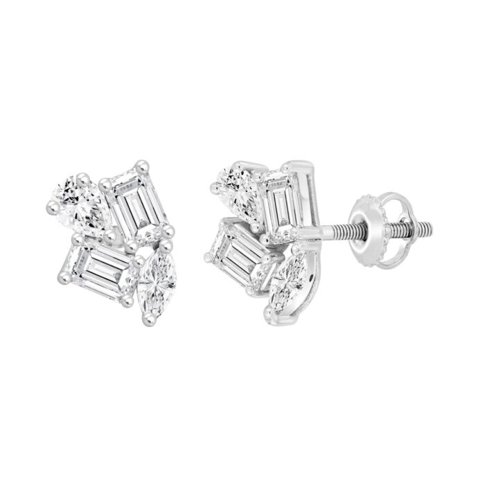 LADIES STUD EARRINGS 2CT EMERALD/PEAR/MARQUISE DIAMOND 14K WHITE GOLD